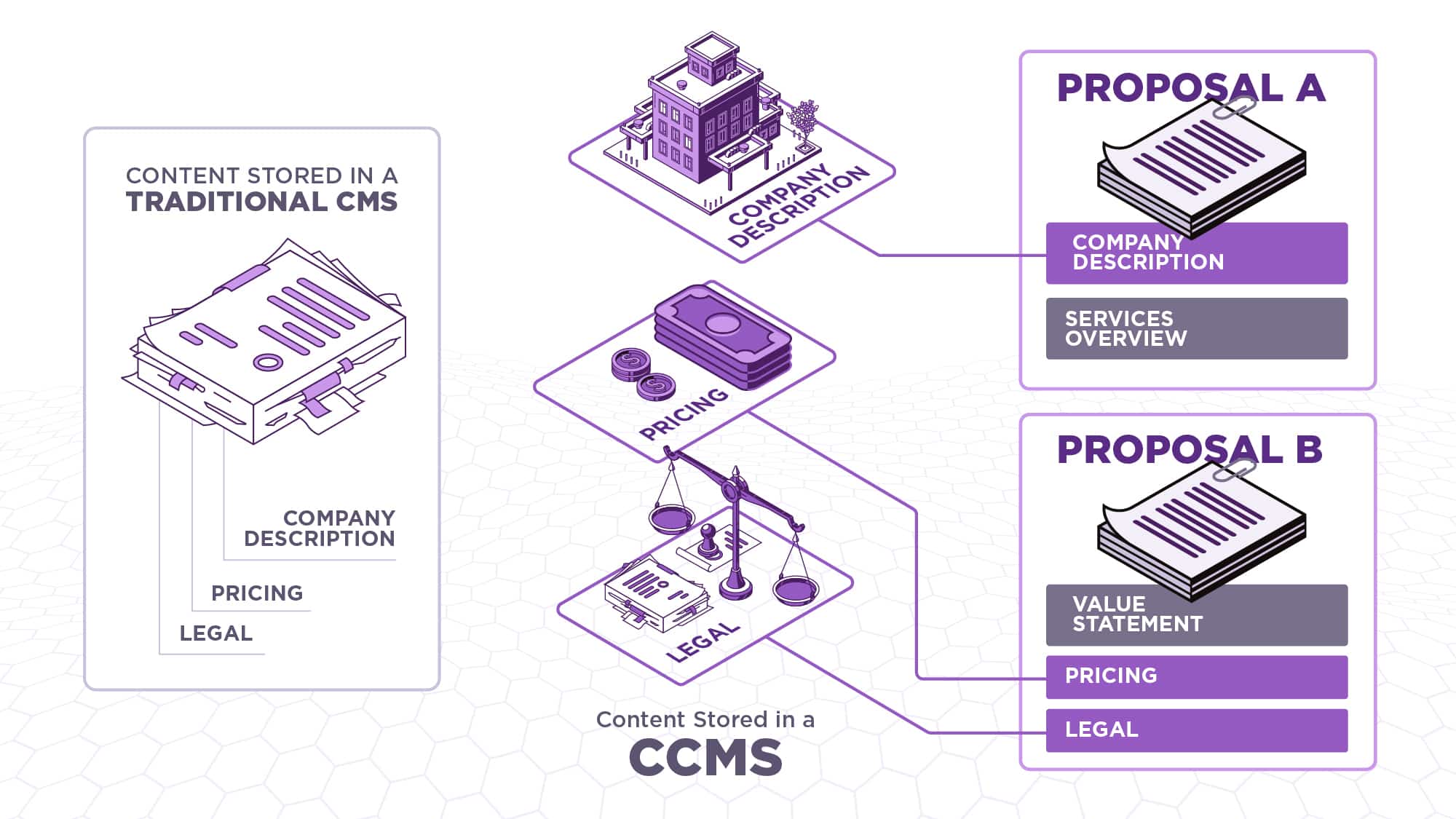 Fundamentally, CCMSs are content management systems that manage content at a component level as opposed to a document level. To break that down further, let’s first define how traditional content management systems (CMS) store content. Traditional CMSs store and tag content by document, even if it consists of many different elements or topics within it. A CCMS, on the other hand, stores content as components that can be combined to build documents dynamically. These components can be thought of as the smaller chunks of content that make up a larger document. For example, a proposal writing team might leverage components to reuse elements of proposals and prevent the need to write from scratch during each effort. The company description, pricing, and legal section might all be separate components that can be selected and reused in as many proposals as needed. This granular level of management creates opportunities to leverage and reuse content in new and valuable ways. Teams no longer have to spend time either searching for and then copy-pasting content from one document to another or simply writing new content. With a CCMS, content teams know they have pre-written and approved sets of content components they can rely on when composing and publishing new content.